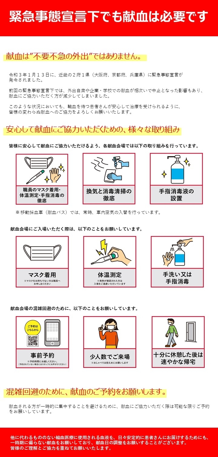 緊急事態宣言下でも、輸血を待つ人は数多くいらっしゃいます。そのための献血協力は決して不要不急ではありませんし、ためらうことは何一つありません。